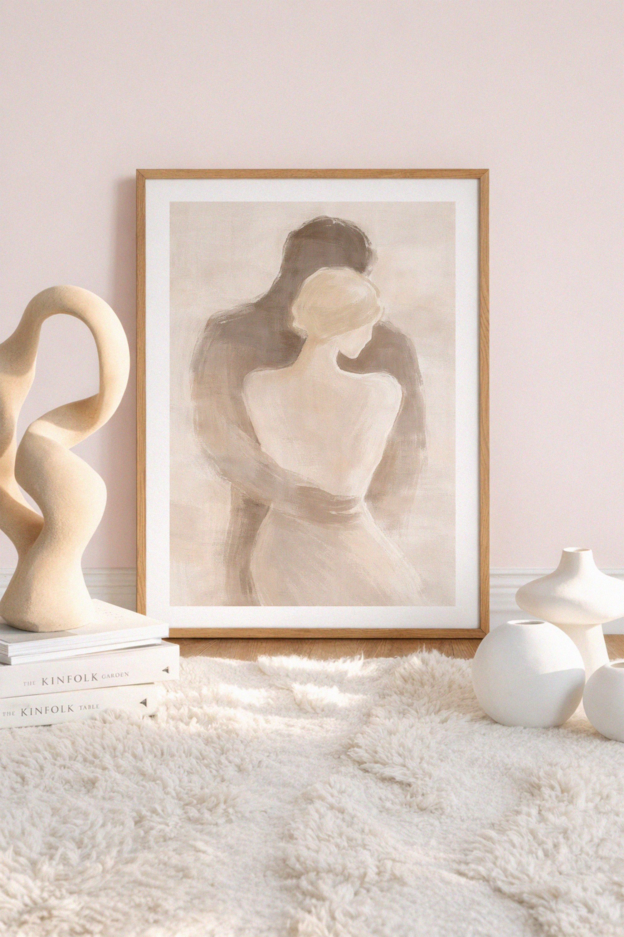 A calm, intimate scene in soft beige and natural colours. The softly painted figures almost merge together and convey closeness, security and quiet emotion. Timeless, understated and perfect for rooms that radiate calm and warmth.